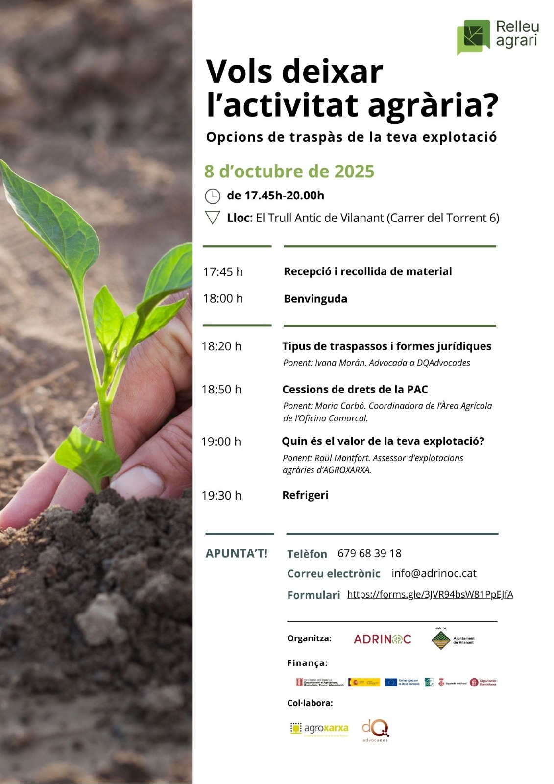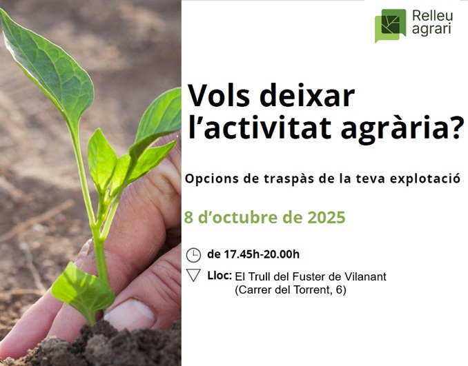 La Jornada es durà a terme el proper 8 d’octubre a la tarda al Trull del Fuster de Vilanant (carrer del Torrent, 6) i porta per títol “Vols deixar l’activitat agrària? Opcions de traspàs de la teva explotació”. A l’acte es parlarà dels tipus de traspassos i formes jurídiques, les cessions dels drets de la PAC i com calcular el valor que té una explotació. La jornada és totalment gratuïta i vol ser també un punt de trobada pels pagesos a on poder reflexionar sobre el procés de relleu, sempre complex en el sector primari.